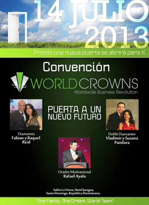 Hoy quiero invitarles a un espectacular evento que se aproxima el Domingo 14 de julio en la ciudad de Santo Domingo, República Dominicana. El evento es la Convención del equipo de World Crowns, titulado como “Puerta a un Nuevo Futuro”